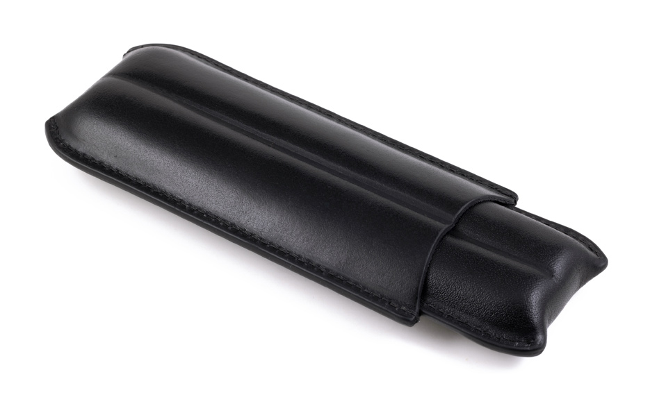 This cigar case is being sold at a discounted price due to being a showroom unit. See Pictures. For further information on this unit please call us at 954-975-2499. SD units are sold as is.This sleek cigar case is designed for style and convenience. Its crafted from classic black bonded leather and holds two cigars up to 7.5 inches in length and a 52-ring gauge. The sleeve-style case is easy to open and close, offering quick access whenever needed and keeps your cigars safe and secure while on the go. Lightweight and compact, it slips easily into pockets or bags, making it ideal for travel. Perfect for any cigar enthusiast, this case combines elegance and function. Overall Dimensions: 7.75" L x 3" W x 1.2" thick.