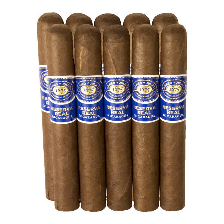 The Romeo y Julieta Reserva Real Nicaragua Robusto cigars are a recent addition to Altadis' line of Nicaraguan versions of the famous Cuban brand. This collaboration between Rafael Nodal, owner of Boutique Brands and the Aging Room line, and AJ Fernandez, a highly respected cigar maker, has resulted in a truly remarkable cigar. This Nicaraguan puro blend, made with the finest aged Cuban seed tobaccos from AJ Fernandez's farms, is a bolder take on the original Romeo y Julieta 1875 series, while still maintaining its creamy smoothness. The cigars feature a dark and oily maduro wrapper, which adds delicious hints of chocolate and black pepper to the already rich blend of wood, cedar, coffee, and cinnamon. With a medium body, the Reserva Real Nicaragua Robusto strikes the perfect balance between flavor and strength, making it a premium cigar suitable for all cigar enthusiasts. These high-quality cigars are now available in convenient 10-packs, perfect for weekend trips, golf outings, fishing trips, or to stock up your favorite travel humidor. Don't wait, order yours from 1st Class Cigar today and ignite a new love affair with the legendary Romeo y Julieta brand.