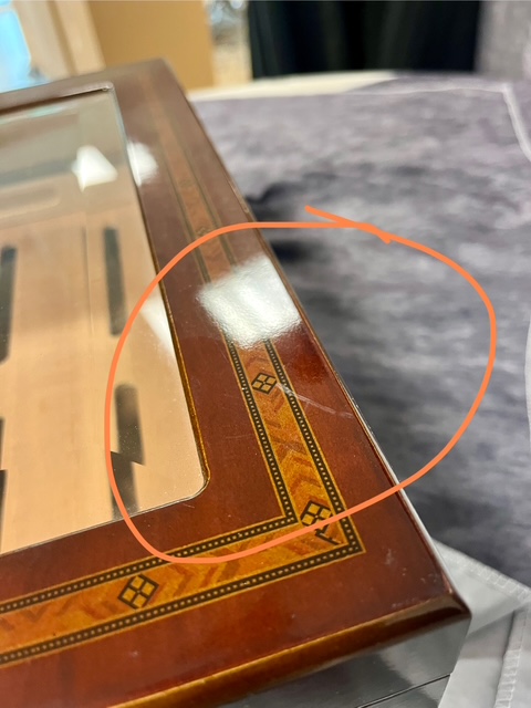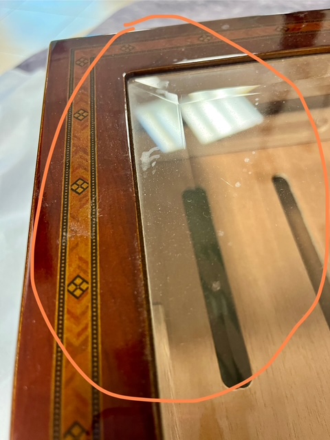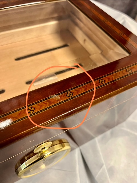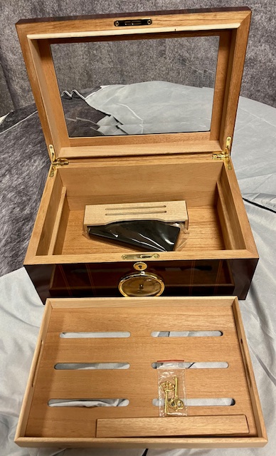 This humidor is being sold at a discounted price due to imperfections and stains on the lid, all accessories are included. See Pictures. For further information on this unit please call us at 954-975-2499. SD units are sold as is.This entirely unique beveled glass top humidor maintains up to 100 of your finest cigars. The Presidential is equipped with a removable tray and 2 spanish cedar dividers. One of the most distinguishing features of the Presidential is its external hygrometer and its bold inlay design on the forefront & lid of the humidor. All of the Presidential's intricate inlays are absolutely gorgeous. This handsome unit carries a high gloss finish, internal locking hinges, 1 large humidifier and gold lock & key set. Very popular!