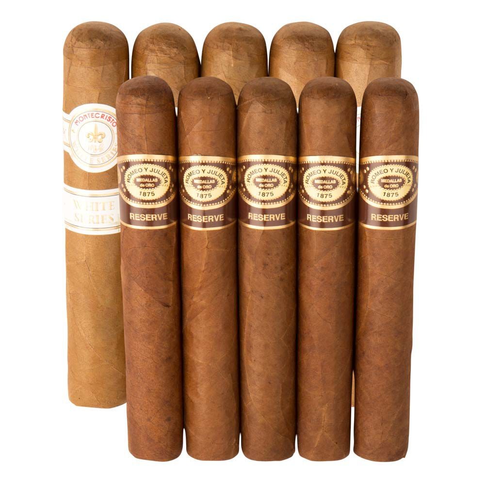 Experience the ultimate cigar collection with the 10Count Romeo Monte Collection. This amazing sampler features 10 top-quality cigars from two renowned Cuban Heritage brands. The set offers a variety of flavors and strengths, starting with 5 Montecristo White Series Rothschilde cigars. Known for its smooth and creamy profile, this classic cigar is a favorite among smokers for its notes of leather, cocoa, cedar, and sweet spice. The collection also includes 5 Romeo y Julieta Reserve Toro cigars, a well-loved blend that has been delighting smokers for over 25 years. This bolder version of the original Dominican Romeo is handcrafted in Honduras, using a deep brown Honduran wrapper and Nicaraguan binder. The long filler tobaccos from Honduras and Nicaragua add a rich complexity to this cigar, with flavors of earth, wood, dark roast coffee, and spice. Perfect for a relaxing evening smoke, the Reserve Toro is a must-try for any cigar connoisseur. The 10Count Romeo Monte Collection can only be found at 1st Class Cigar, and at our unbeatable prices. Don't miss out on this sampler that includes 5 Romeo y Julieta Reserve Toro and 5 Montecristo White Series Rothchilde cigars.