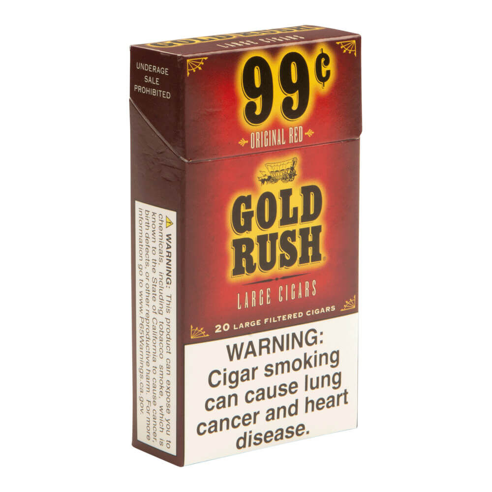 Gold Rush Red machine-made cigars have gained a great reputation among regular smokers for their exceptional quality, delightful flavor, and affordable price. These cigars are crafted with high-quality, natural short filler tobacco and are wrapped in a homogenized binder and wrapper. With a mellow strength, these 3.90 x 20 cigars are the ideal 10-minute companion for quick breaks, running errands, or when time is limited for enjoying a larger hand-made premium cigar. Every puff brings forth a rich, nutty taste with a perfect hint of sweet tobacco. These delectable cigars are available in packs of 10, with 20 Red cigars in each pack. If you are searching for a reasonably priced, filter-tipped cigar that does not compromise on flavor, then look no further than Gold Rush Red.