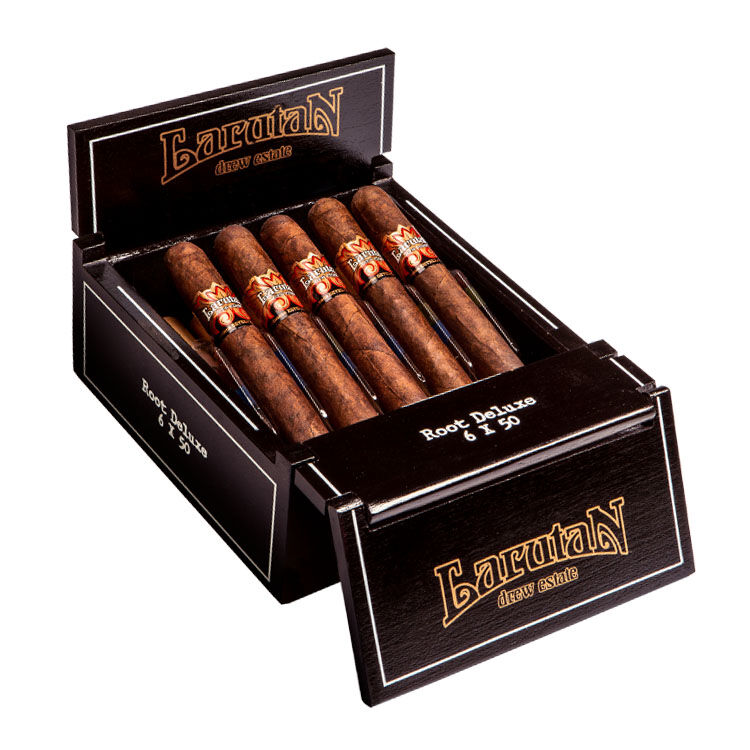 A package containing 10 Larutan cigars, specifically the Drew Estate Root Deluxe variety with a length of 6 inches and a ring gauge of 50.| Origin: | Nicaragua | Strength: | Medium |
