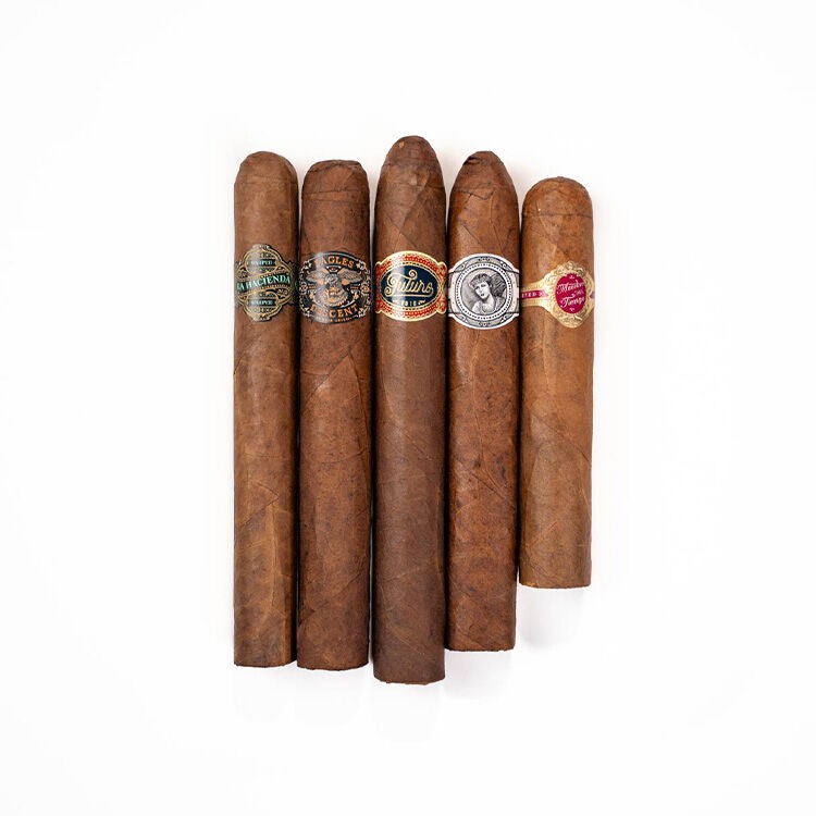 Since its debut in 2009, Warped has been one of the most popular and top-selling boutique brands on the market. Kyle Gellis, the brand owner, was inspired by traditional Cuban production and blending techniques to provide a classic Cuban cigar experience in each blend. Made in small quantities, Kyle utilizes mostly different varietals of Nicaraguan tobacco from the nation's top growing regions to mimic the taste, character, and aroma of pre-embargo Cuban cigars. Our exclusive Top 5 Warped Cigars selection gives you the opportunity to sample five of Warped's bestseller blends. This premium assortment includes one cigar from the Nicotina, Eagles Descent, Maestro del Tiempo, Futuro MF Seleccion, and La Hacienda lines, with strengths ranging from medium to full bodied. All of these cigars feature the world's best fully-aged Nicaraguan tobaccos, each with its own unique Cuban flavor profile. Whether you're just looking to try Warped cigars or you need an affordable way to decide if you should buy a box, this sampler will give you a good idea of what the brand can offer. Place your order for the Top 5 Warped Cigars today and you'll soon find some of your newest favorite smokes.